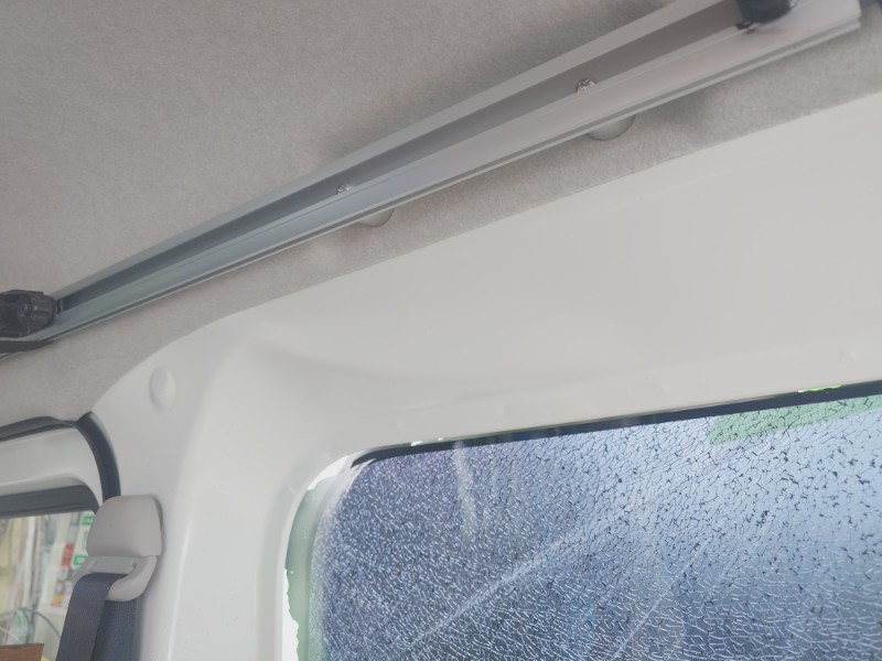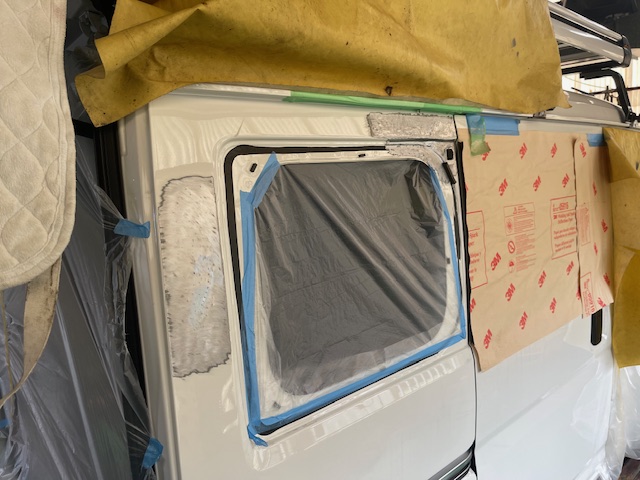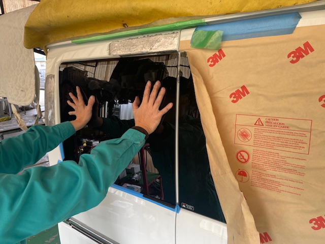 新品のガラスで狩り合わせを行い形状を確認してからパテ作業に移ります。