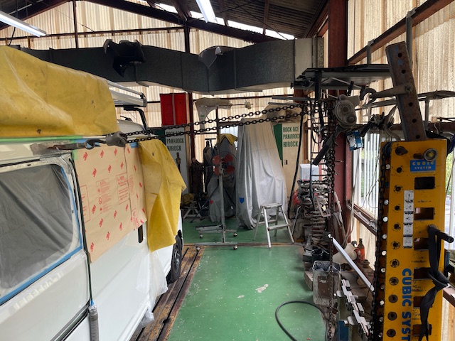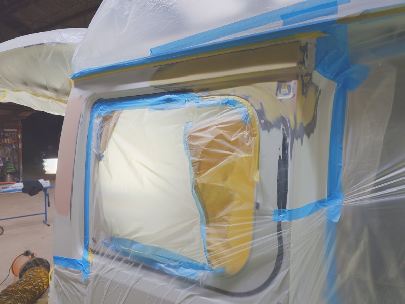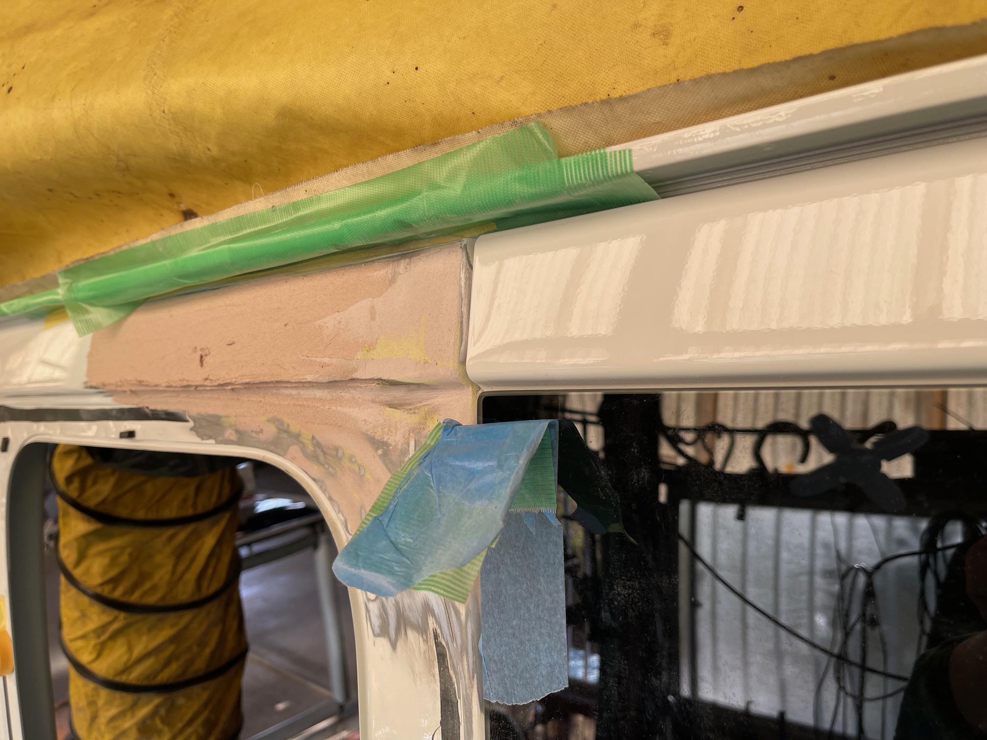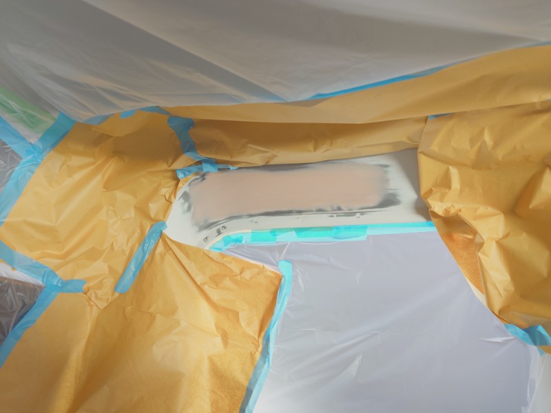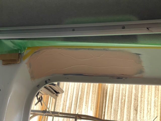 仕上げのパテ作業にかかります、スチレンフリーのパテを使用しているのですが匂いはきついのでダクトを使用して車内に残らないよう排出しました。