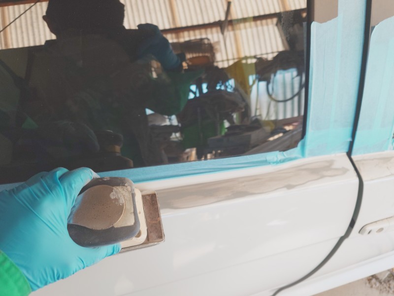 水切りモールを再使用できるように取り外し、右側、前後ドアの修理にかかります。