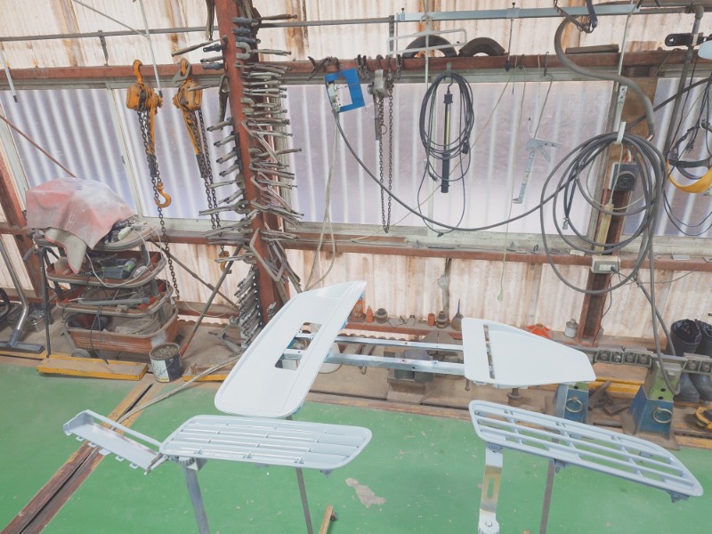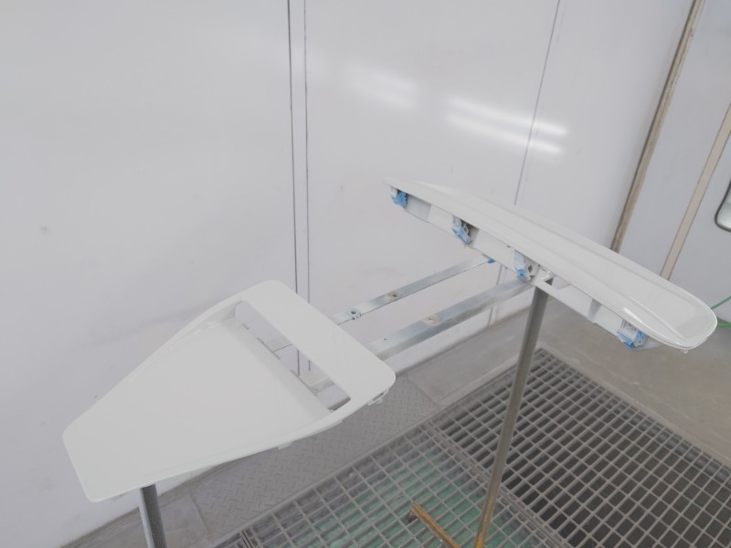亜鉛プライマーを加熱硬化させてから足付け研磨を行いホワイト系の二液型サフェーサーの塗装を行っています。