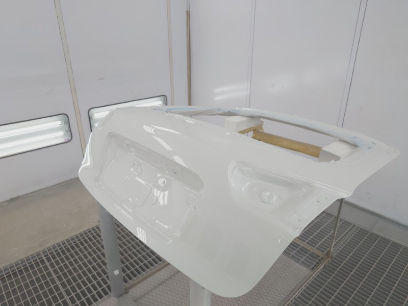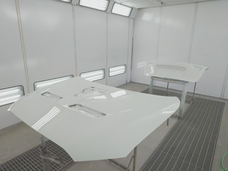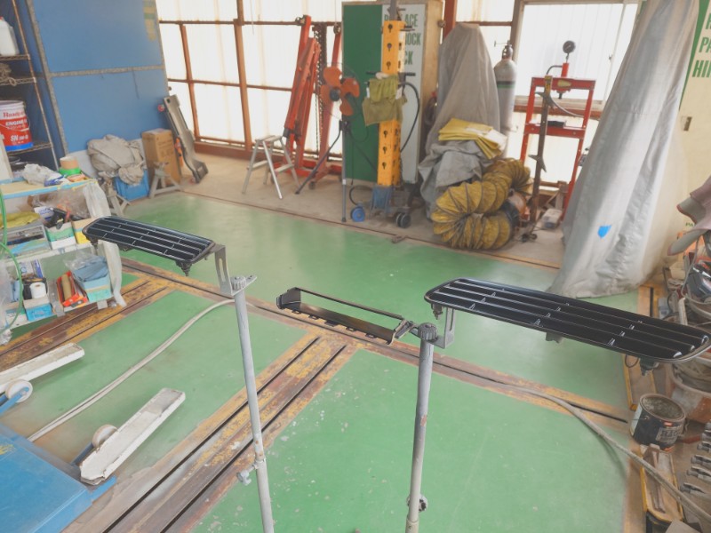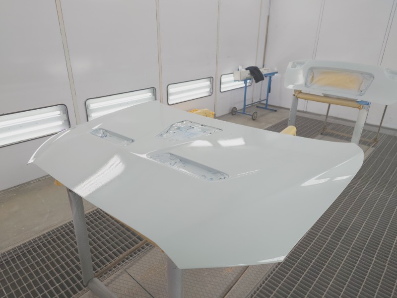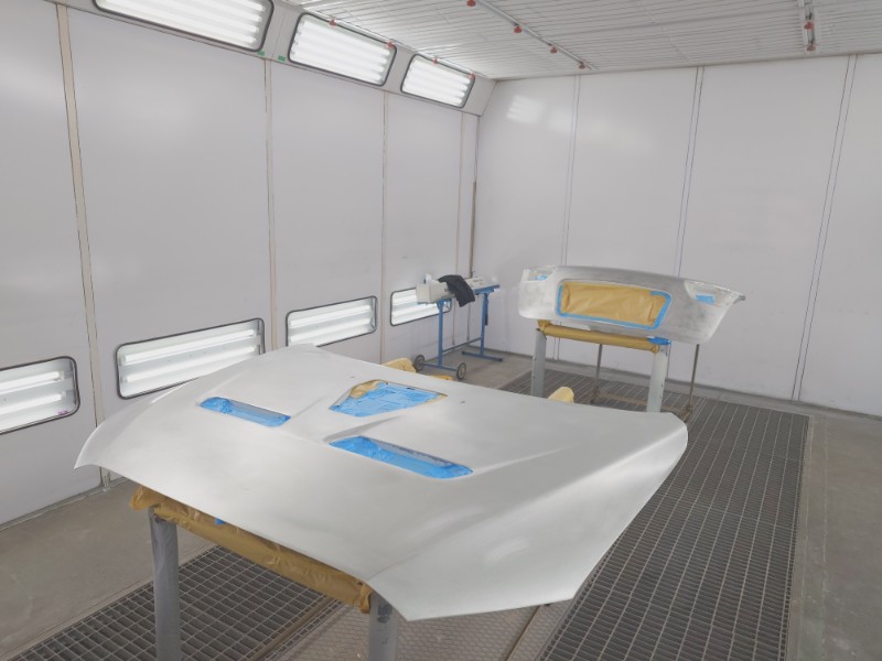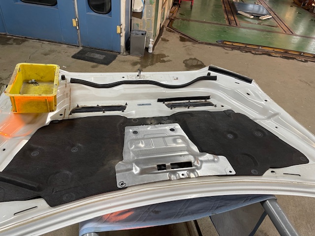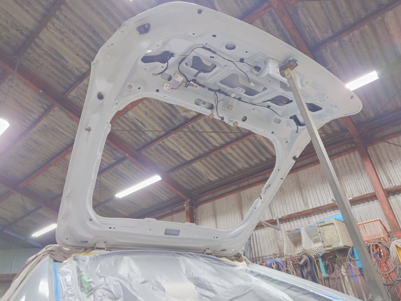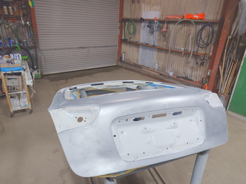 分解を行ったボンネットのダクト、リアゲートのガーニッシュも同時にサフェーサーの塗装を行います。