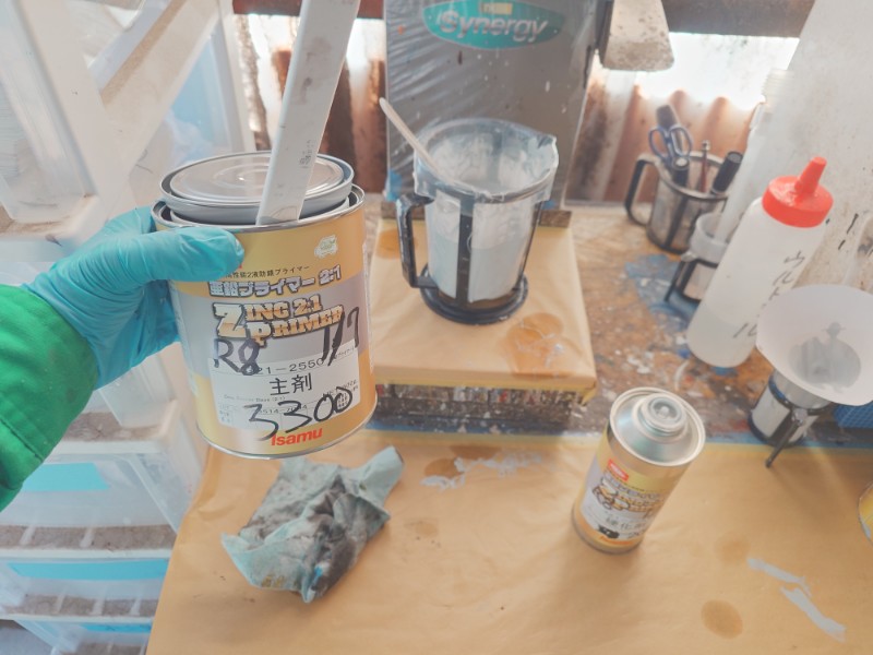 マスキングとシリコンオフによる脱脂を行い、亜鉛プライマーの塗装を開始します。