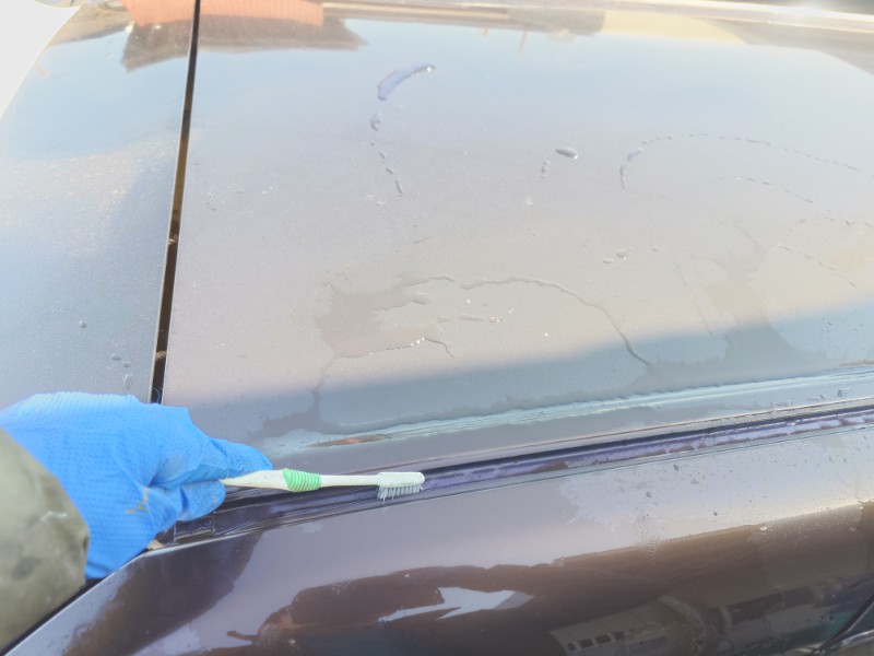 ルーフモールを外してミゾの中の泥汚れを水とハブラシを使用して掃除を行っています。