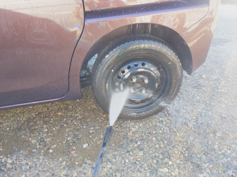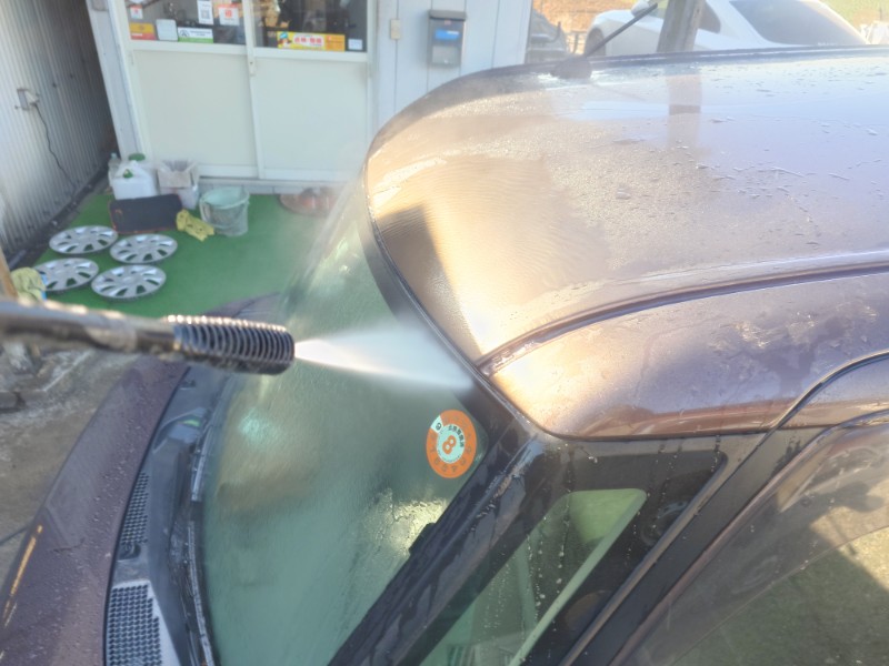 塗装中異物が出てきにくいように高圧洗車機を使用してモールがつく部分とフロントガラスのモール部分をヘラで隙間を開き内部を洗浄しています。