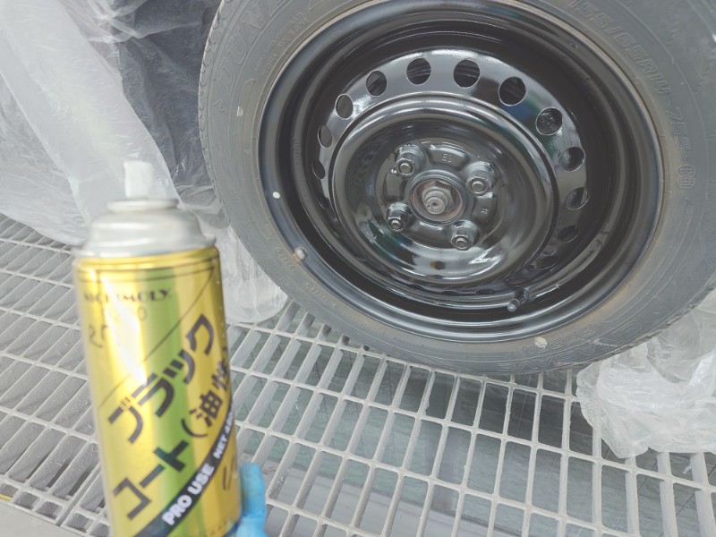 サフェーサー塗装時、同時に鉄板面の出たホイールもサフェーサー塗装を行いシャーシブラック塗装で仕上げています