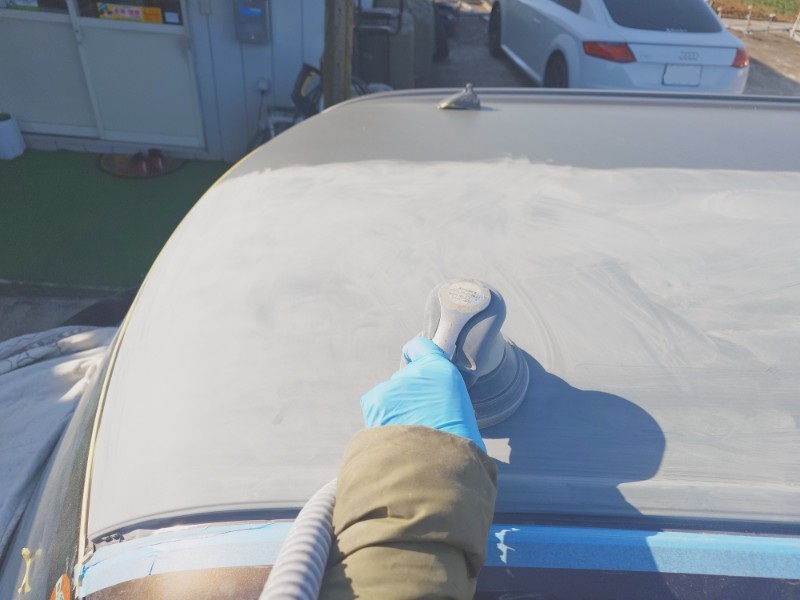ダブルアクションサンダーを使用して劣化が進んだ塗膜の除去作業にかかりました。
