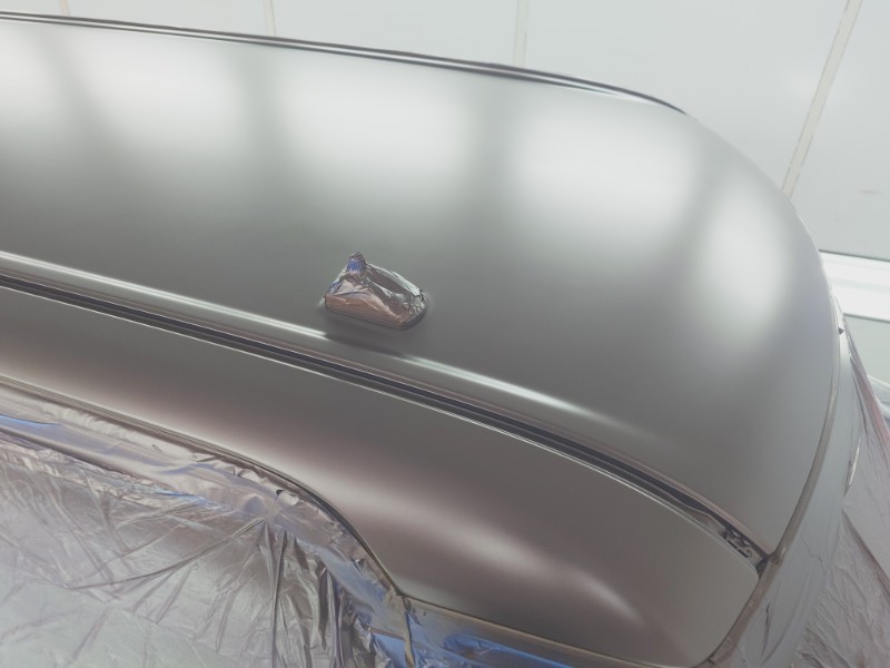マスキングを終えてシリコンオフによる脱脂、タッククロスを使用しながらエアーブローでほこりの除去を行い塗装を開始します。
