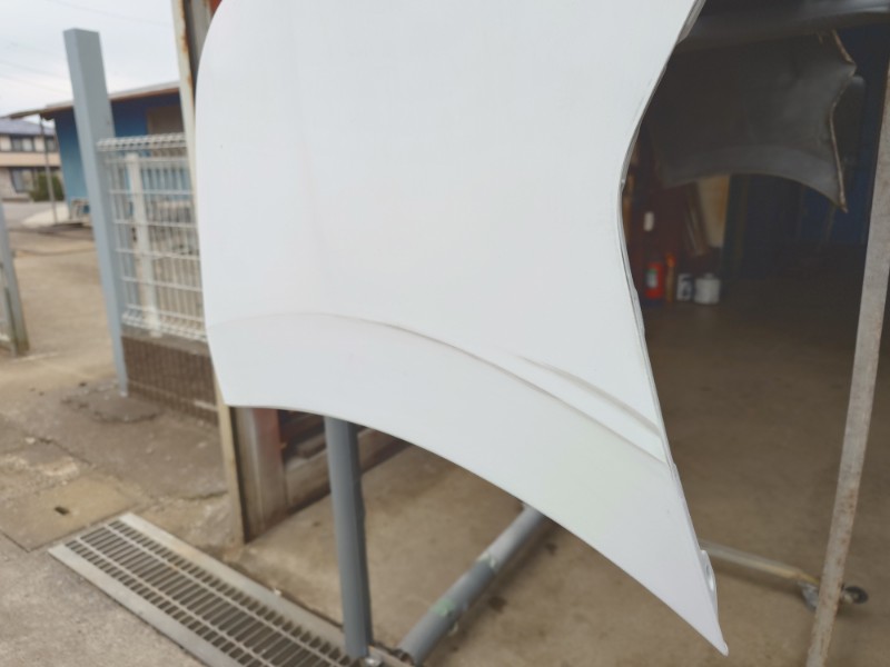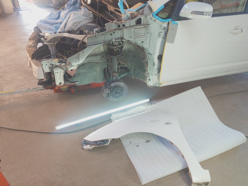 フェンダーパネルはへこみ損傷もあり、リサイクルパーツを使用した取り換え作業をいたします。