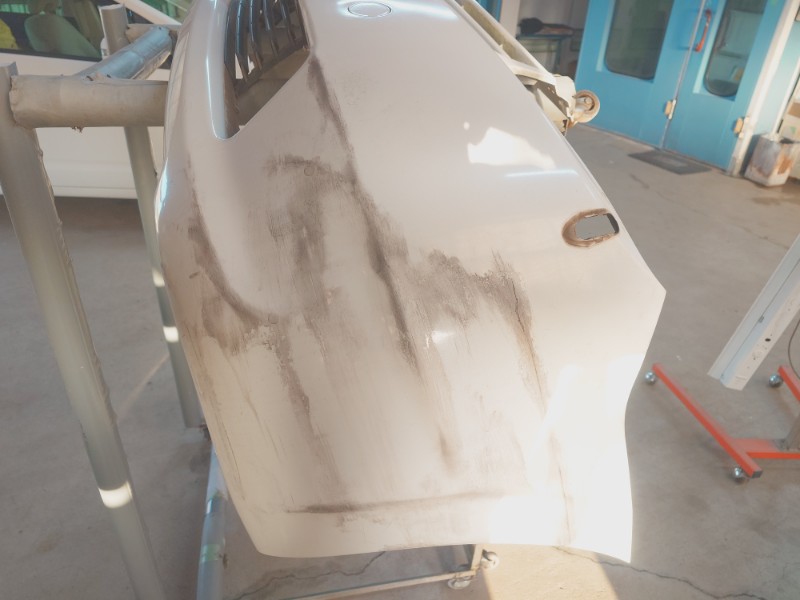 ダブルアクションサンダーを使用して傷を研ぎだす前に黒いガイドコートを付けて損傷の範囲を特定しました。