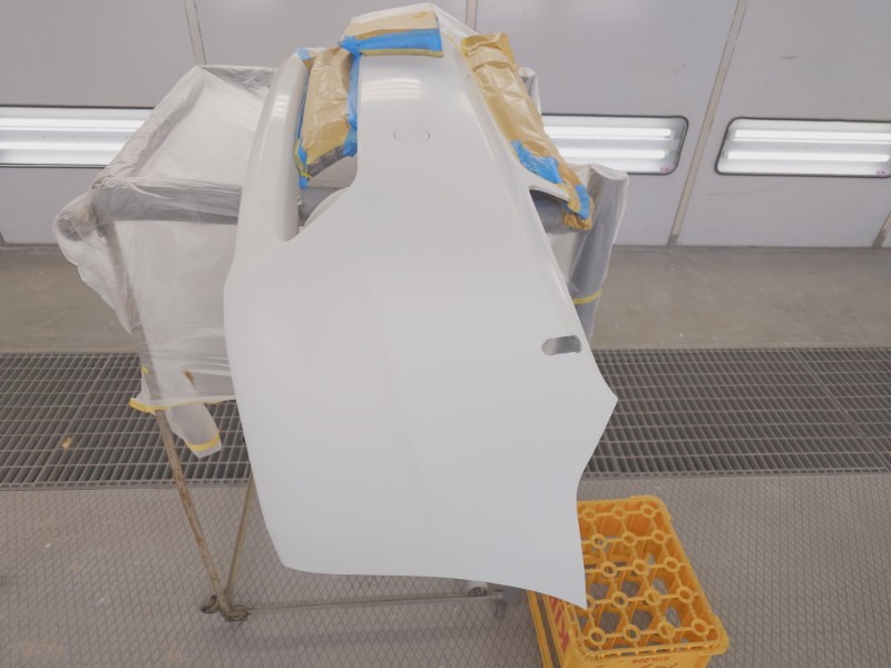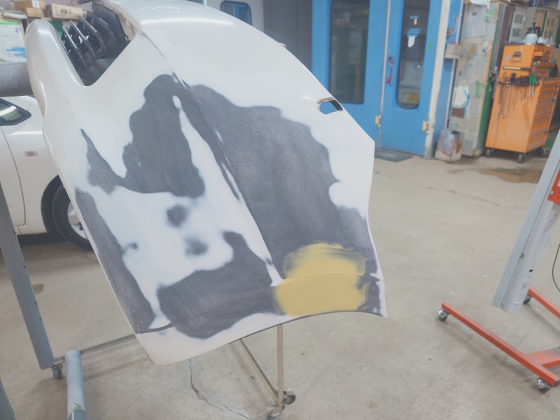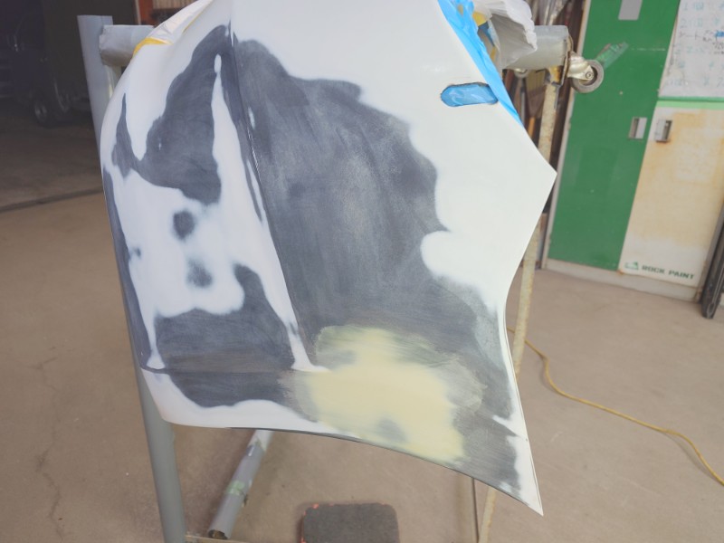 整形後にマスキングとPPプライマーの塗布を行い、柔軟性のある樹脂仕様の二液型サフェーサーを塗装しています。