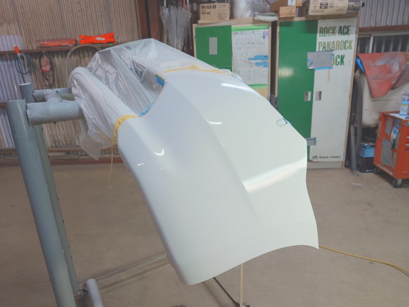 シリコンオフを使用して脱脂を行った後にベースカラーを3回、パールベースを4回、柔軟性のある樹脂配合のクリアーを3回塗装を行いボカシ剤を使用してナンバー手前でクリアー塗装を終わらせています。