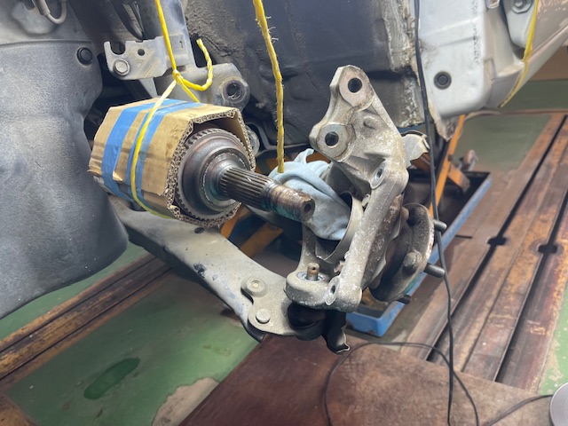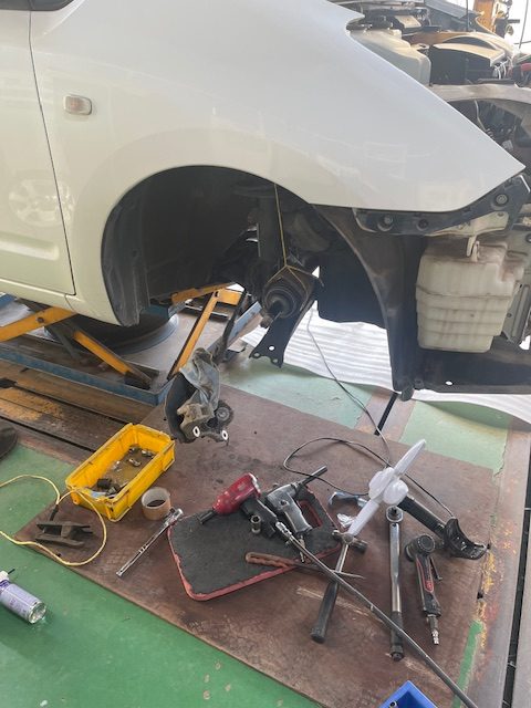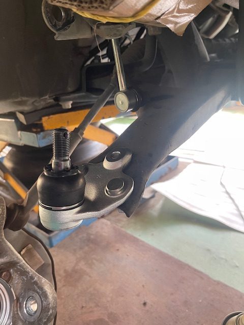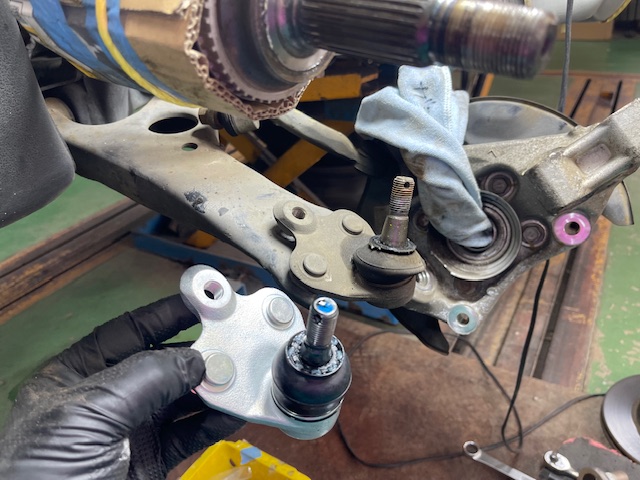 ロアボールジョイント左右ブーツが切れてグリスが漏れているので純正新品部品に取り換え作業を行います。