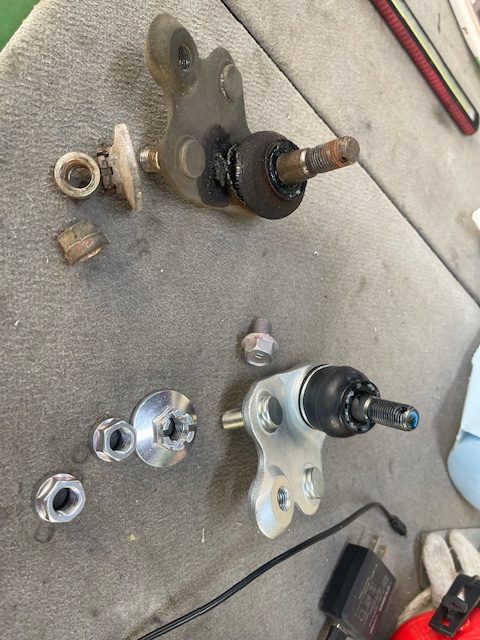 右側ロアアームに新品のボールジョイントが付きました、分解を行った部品を組付けていきます。